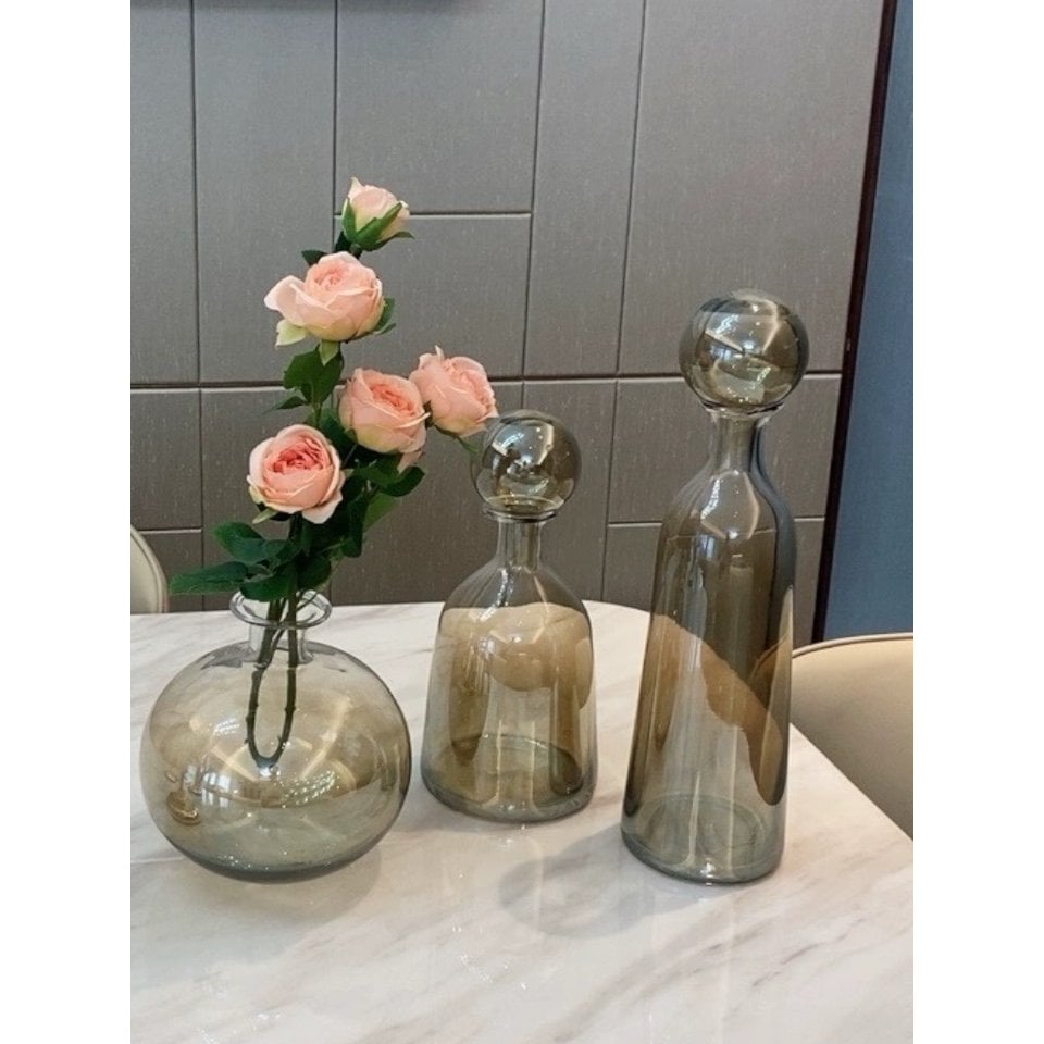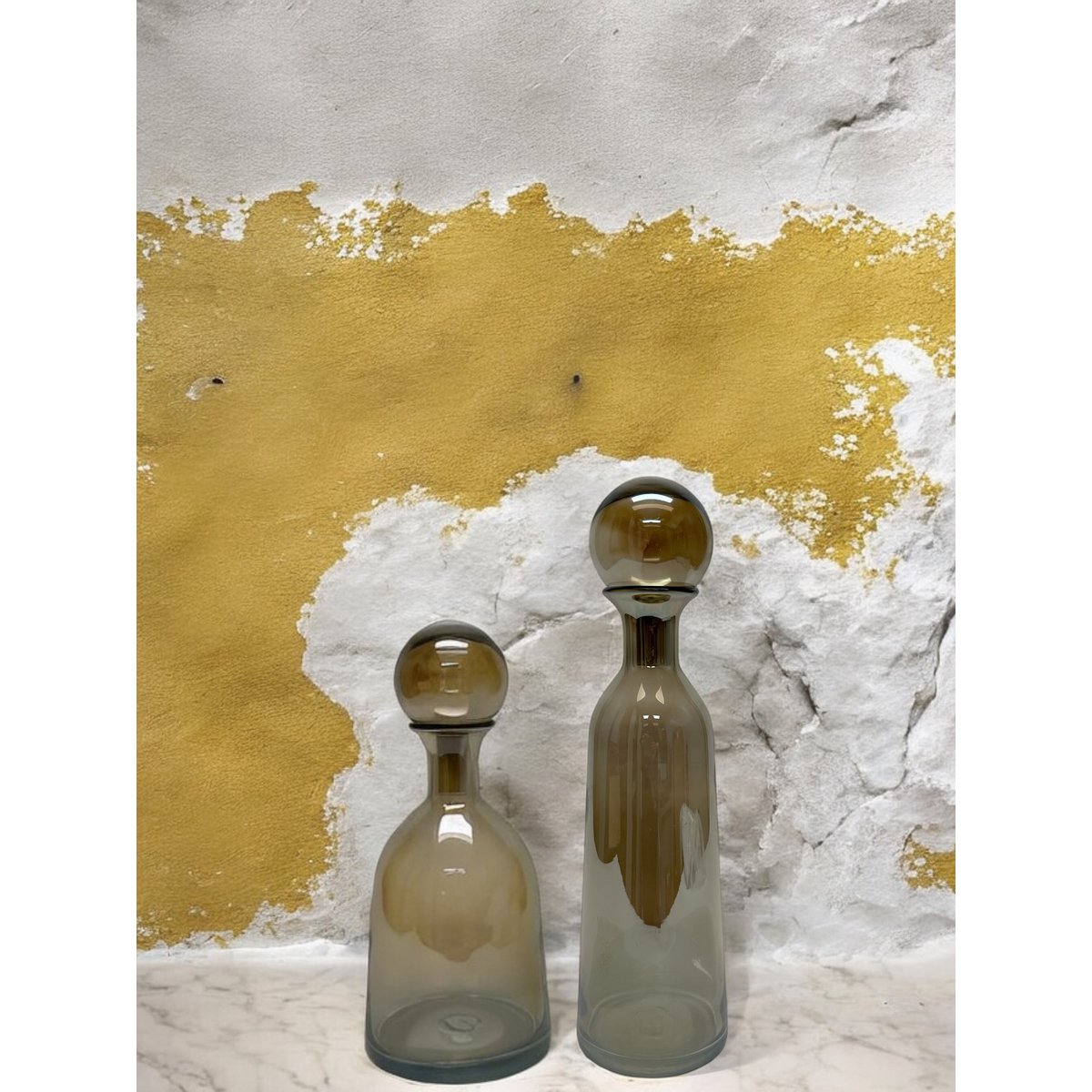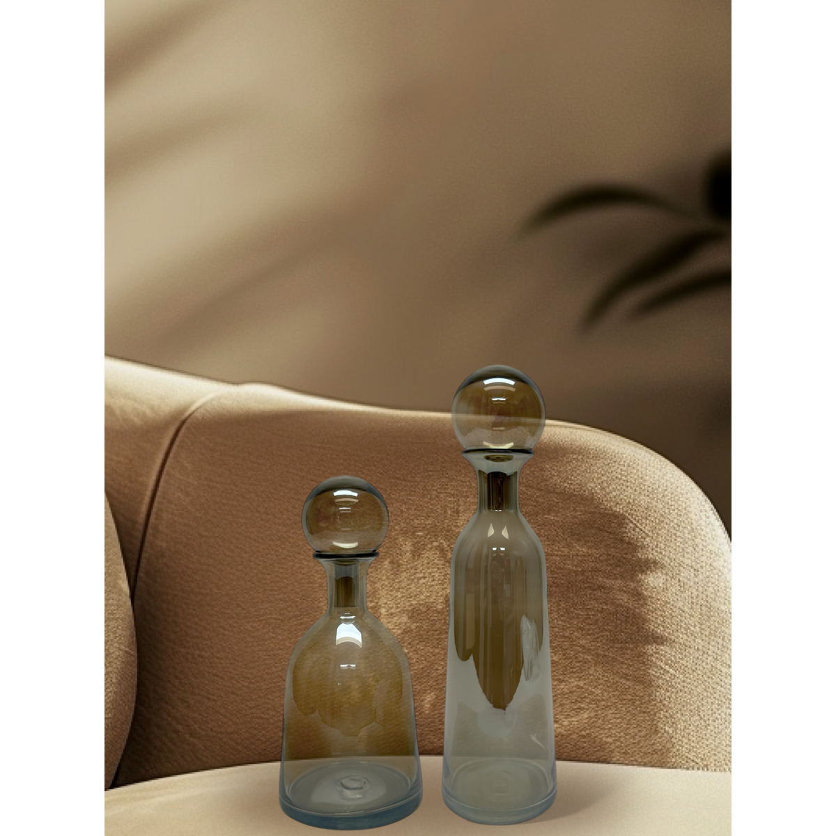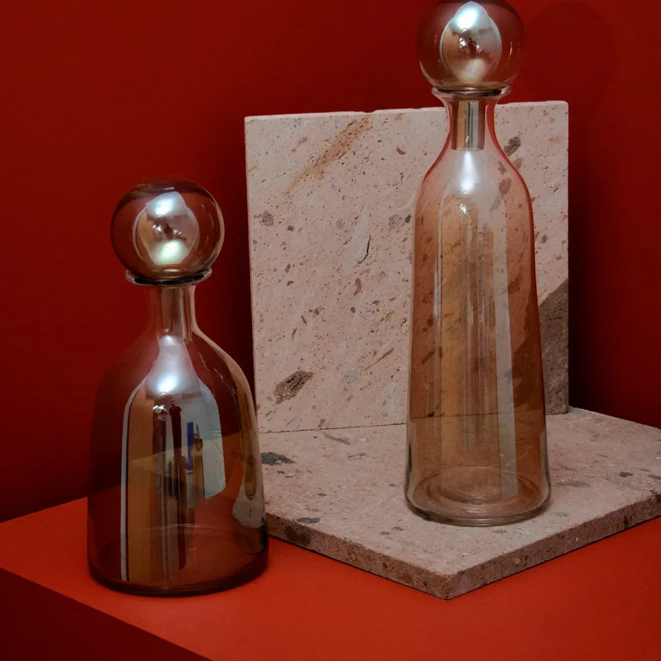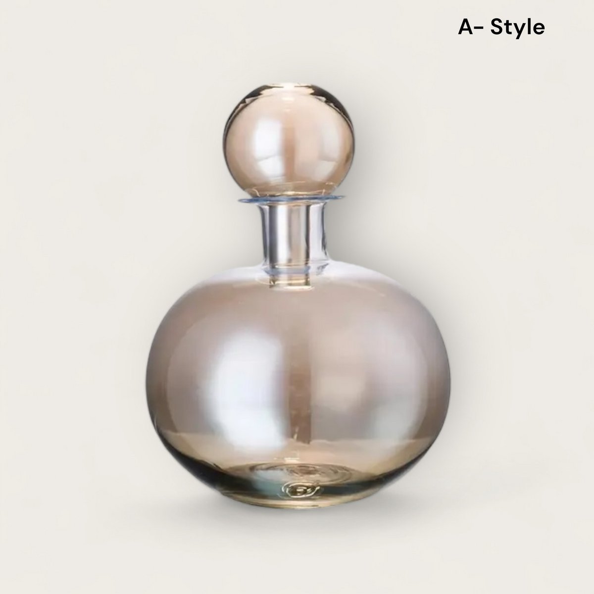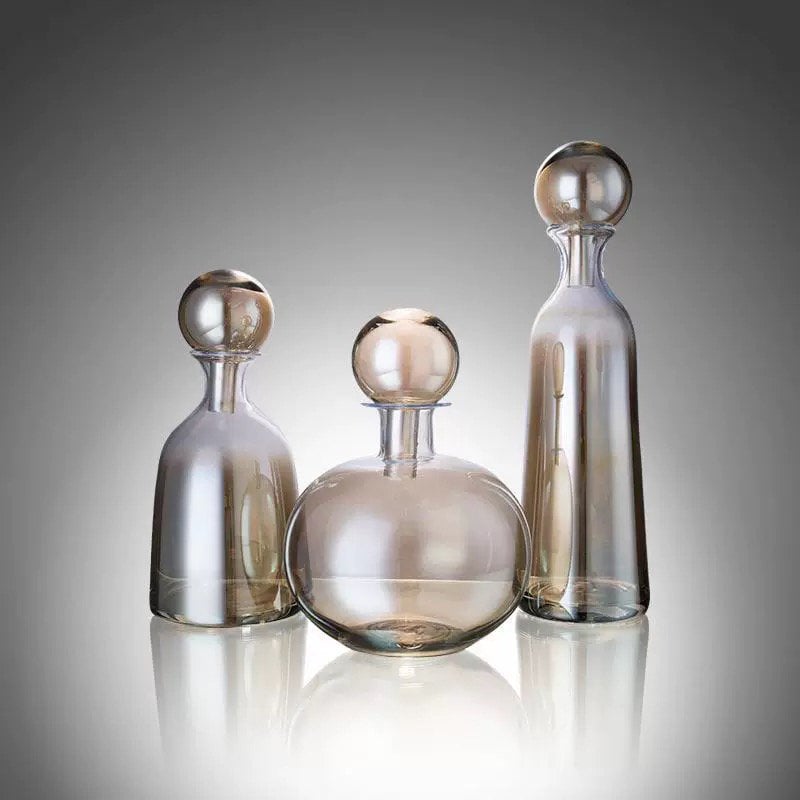 Deze set stijlvolle parelmoerkleurige amberkleurige glazen flessen is gemaakt van hoogwaardig fijn glas. Het bestaat uit drie delen met afneembare deksels, met strakke lijnen en een luxueuze, elegante moderne stijl, perfect voor het decoreren van de eettafel of open kasten.