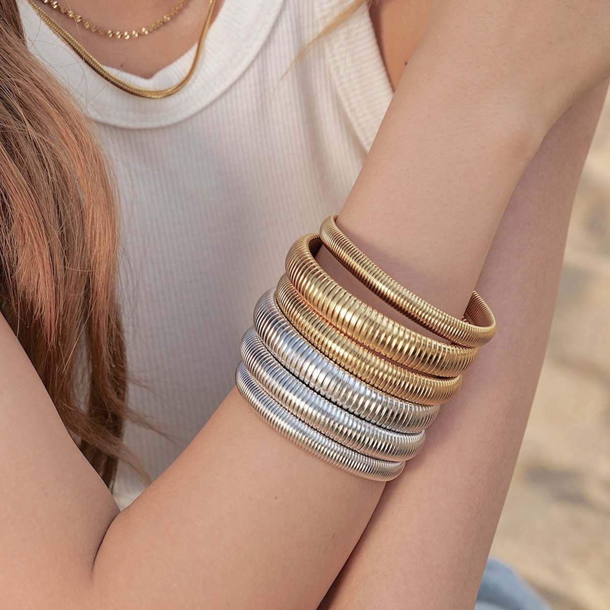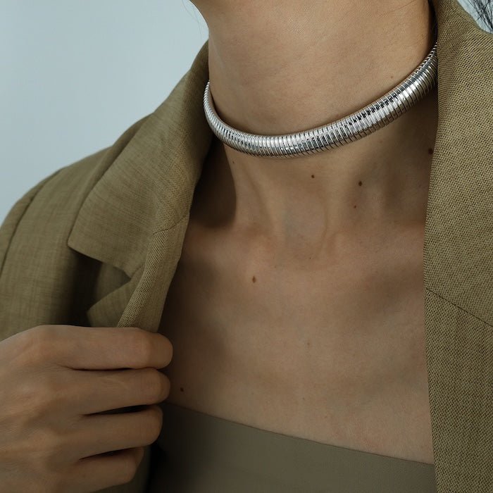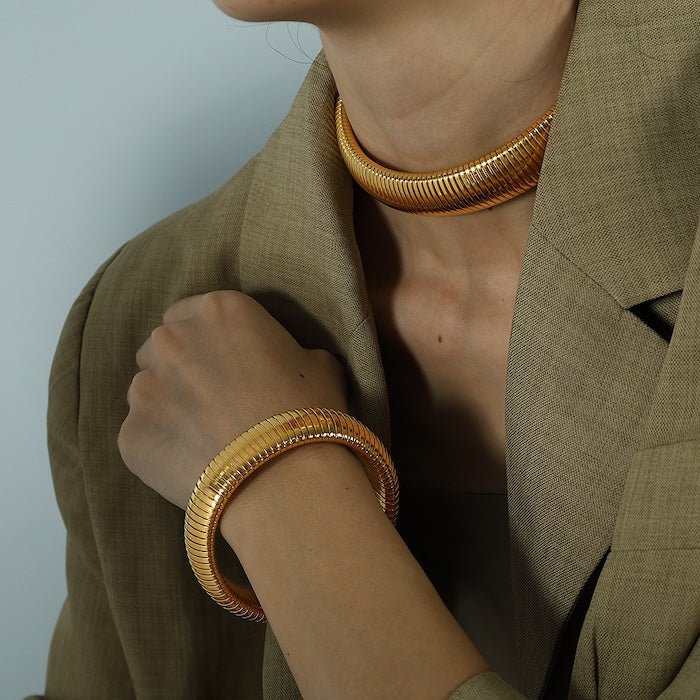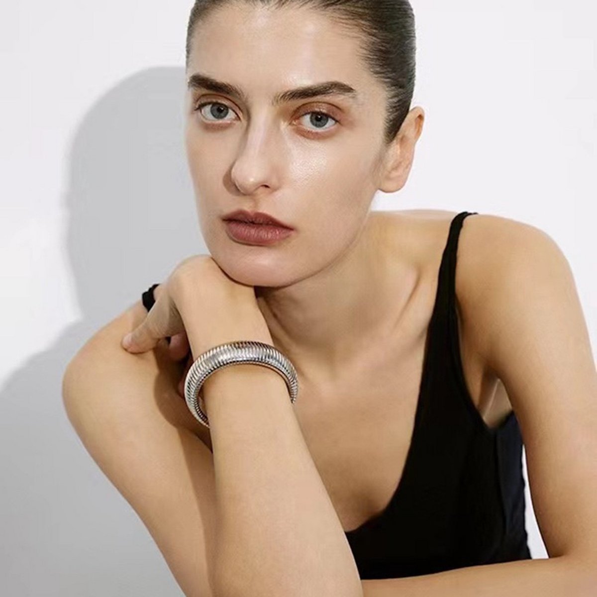 Deze armband- en choker-sieradenset heeft een rekbaar ontwerp voor een zachte touch en belichaamt de essentie van een minimalistische stijl. Verkrijgbaar in twee chique kleuren – goud en verzilverd op roestvrij staal – en past moeiteloos bij zowel casual als formele looks. Armbanden zijn verkrijgbaar in de breedtes 0,8 cm, 1,2 cm en 2 cm, de lengte is 20 cm. Chokers zijn verkrijgbaar in de breedtes 0,8 cm, 1,2 cm en 2 cm, de verstelbare lengte is 34+5 cm. Met een keuze tussen smalle en brede opties biedt deze armband veelzijdigheid in styling. De mogelijkheid om deze armbanden en chokers te stapelen versterkt de stevige aantrekkingskracht en geeft uw ensemble een modieus tintje. Ideaal om te combineren met een blazer of andere stijlvolle outfits, de moderne minimalistische stretcharmband is een must-have accessoire en ook een perfect cadeau voor haar!