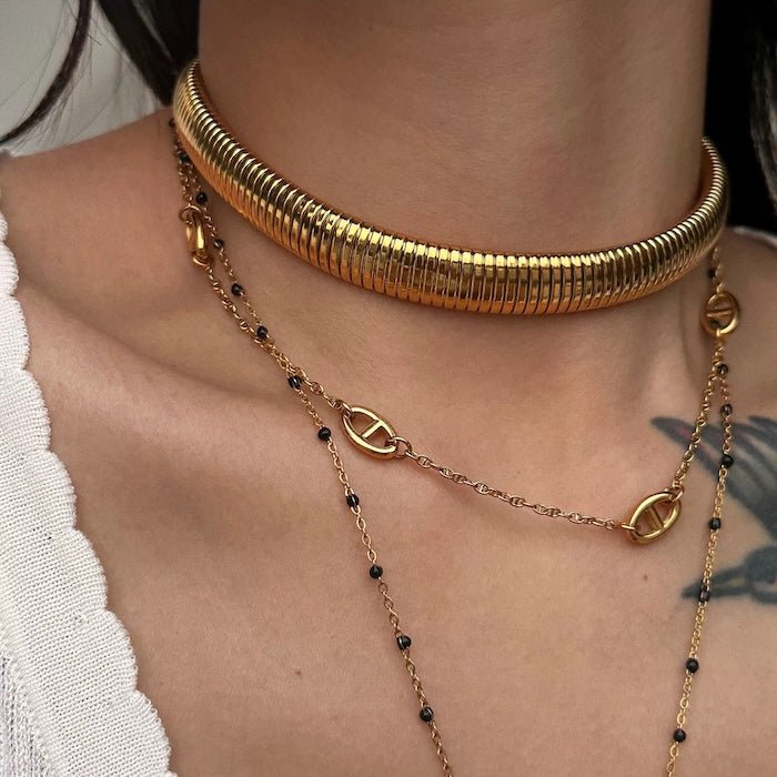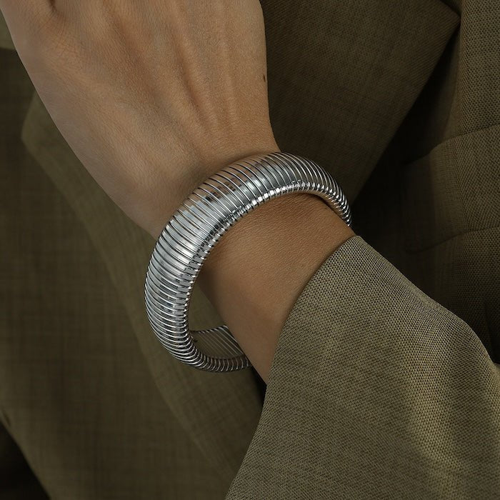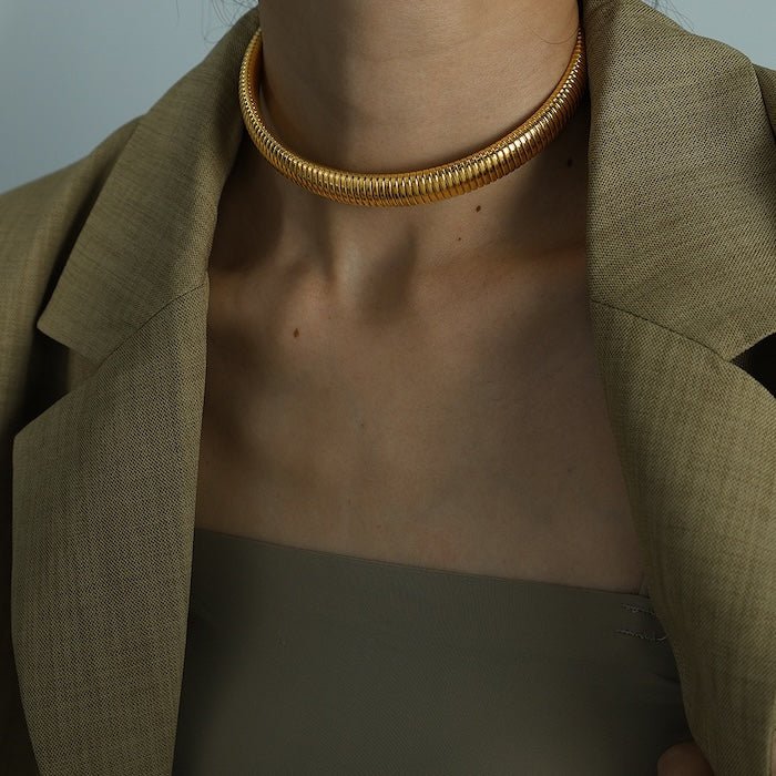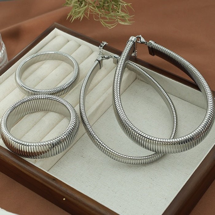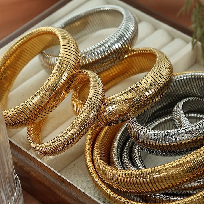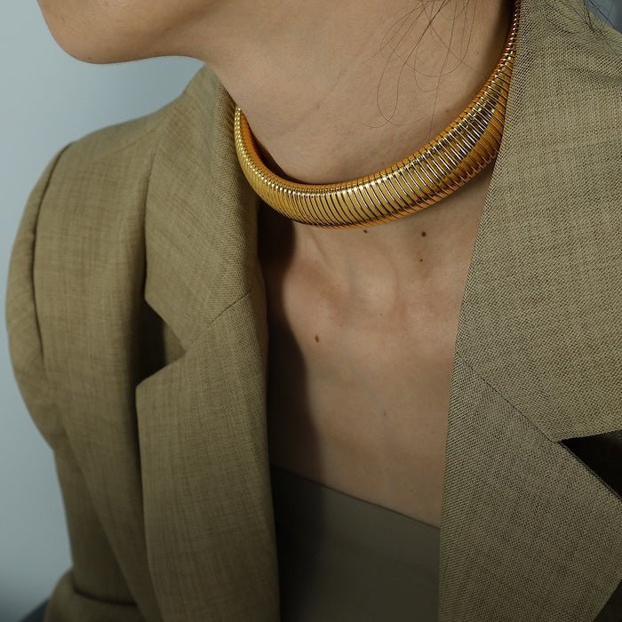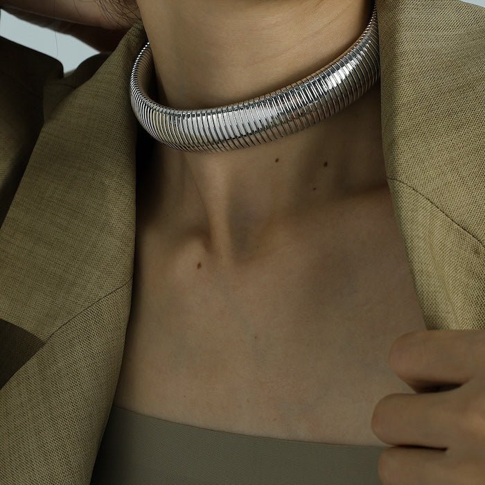 Deze armband- en choker-sieradenset heeft een rekbaar ontwerp voor een zachte touch en belichaamt de essentie van een minimalistische stijl. Verkrijgbaar in twee chique kleuren – goud en verzilverd op roestvrij staal – en past moeiteloos bij zowel casual als formele looks. Armbanden zijn verkrijgbaar in de breedtes 0,8 cm, 1,2 cm en 2 cm, de lengte is 20 cm. Chokers zijn verkrijgbaar in de breedtes 0,8 cm, 1,2 cm en 2 cm, de verstelbare lengte is 34+5 cm. Met een keuze tussen smalle en brede opties biedt deze armband veelzijdigheid in styling. De mogelijkheid om deze armbanden en chokers te stapelen versterkt de stevige aantrekkingskracht en geeft uw ensemble een modieus tintje. Ideaal om te combineren met een blazer of andere stijlvolle outfits, de moderne minimalistische stretcharmband is een must-have accessoire en ook een perfect cadeau voor haar!