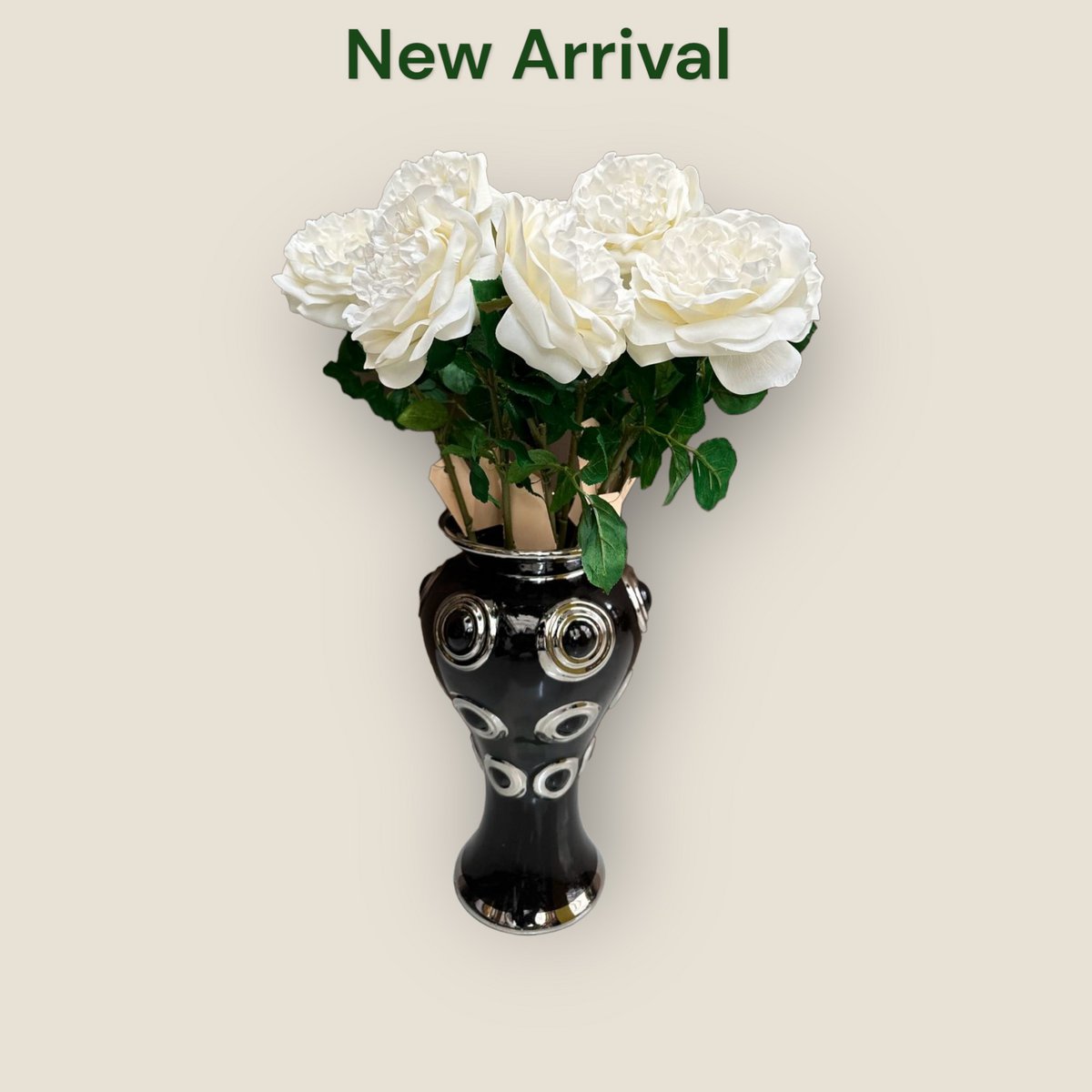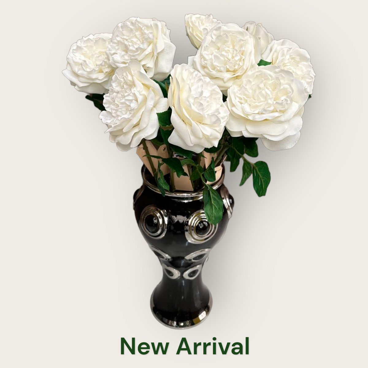 Een prachtige zwarte vaas met 10 grote, witte bloemen.