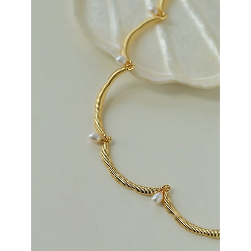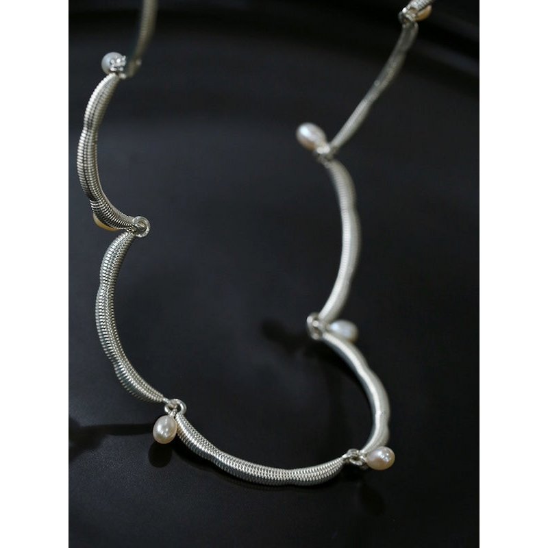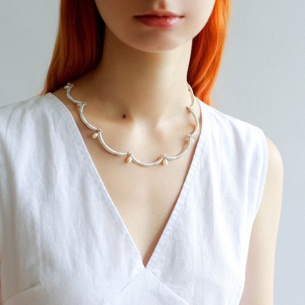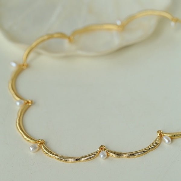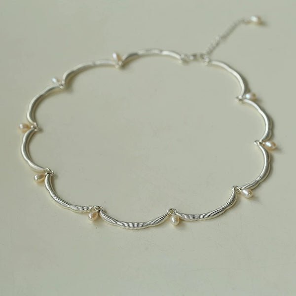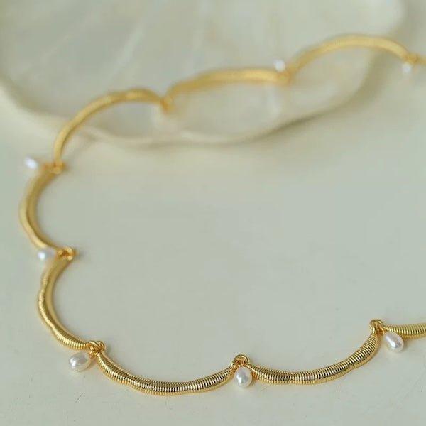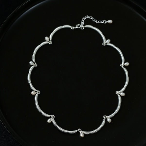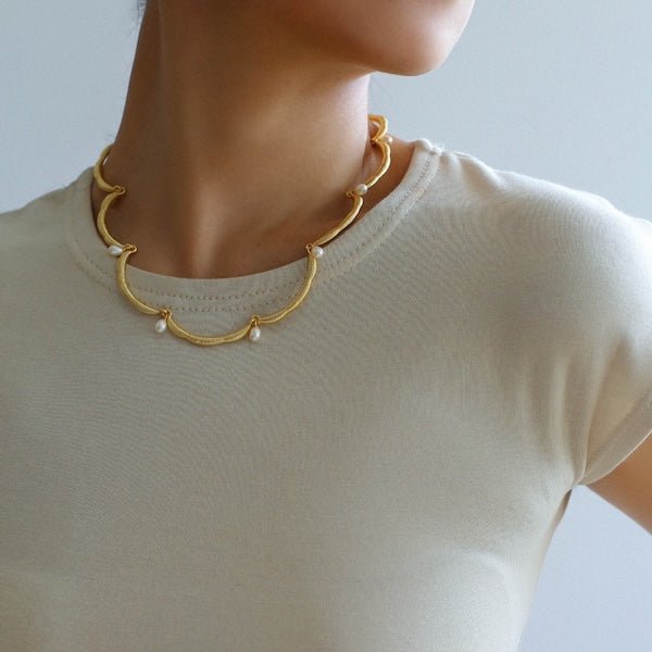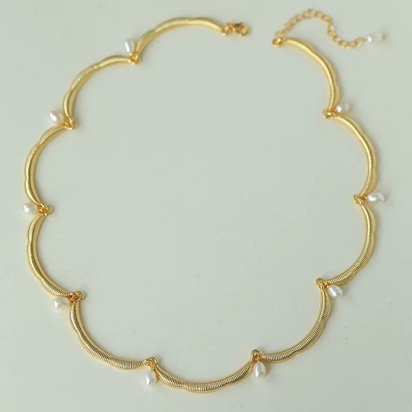 Deze delicate ketting straalt elegantie uit met zijn unieke, op bloemen geïnspireerde kanten rand, prachtig geaccentueerd door glanzende zoetwaterparels. De zachte rondingen van de kantachtige structuur geven de ketting een luchtige, verfijnde uitstraling die elke outfit verfraait. Het is verkrijgbaar in zowel goud- als zilvertinten en integreert naadloos met verschillende stijlen, waardoor een vleugje vintage charme en moderne elegantie wordt toegevoegd. Deze ketting is gemaakt van messing en is verguld in goud of zilver, wat zorgt voor een prachtige afwerking die zowel duurzaam als stijlvol is. De verstelbare lengte van 40 cm met een extra verlengstuk van 5 cm zorgt voor een pasvorm op maat. Deze ketting is een ideaal cadeau voor een speciaal iemand en legt elegantie en verfijning vast in een uniek ontwerp.