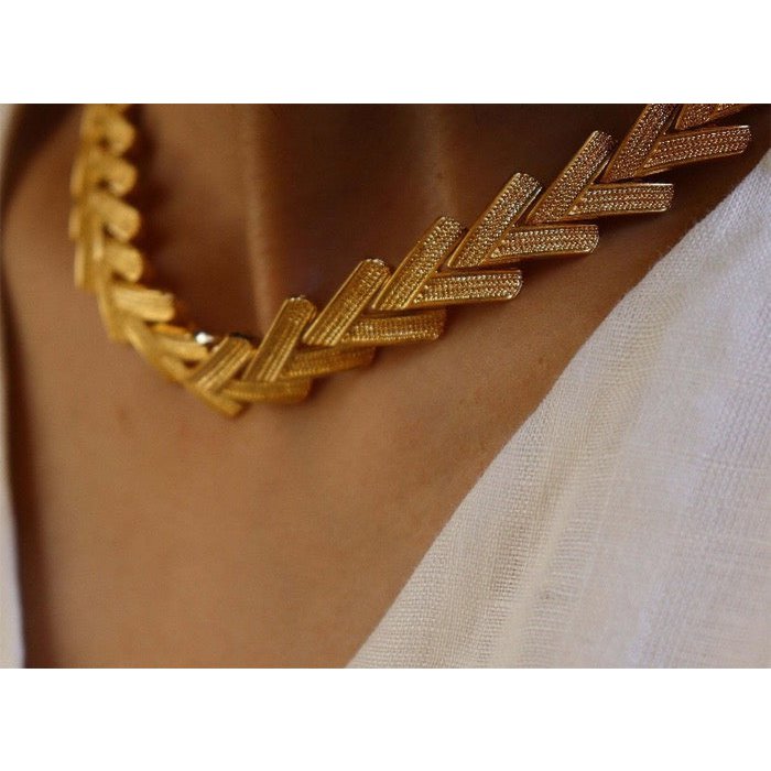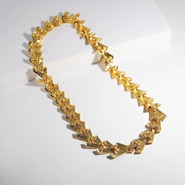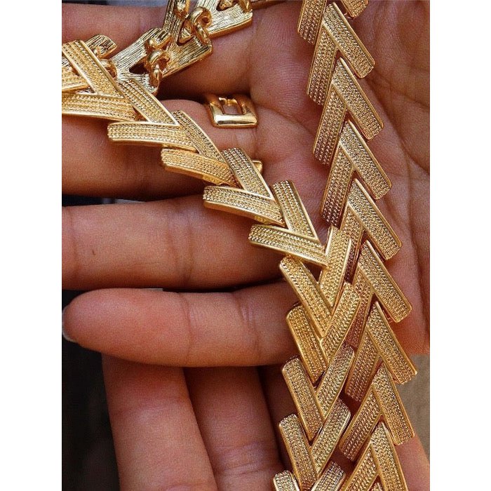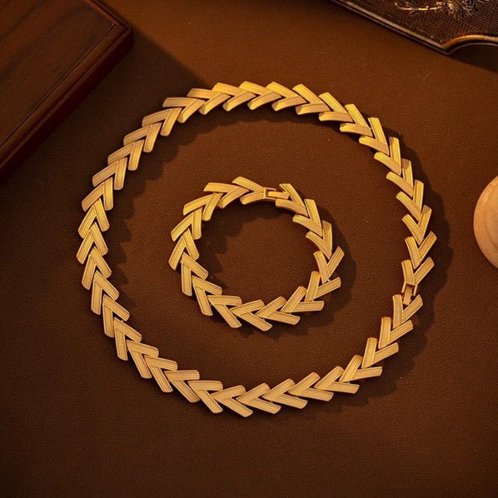 Dit boeiende ensemble heeft een opvallend V-vormig ontwerp, versierd met een geometrische ketting voor een opvallende vintage-geïnspireerde look. Elk stuk...