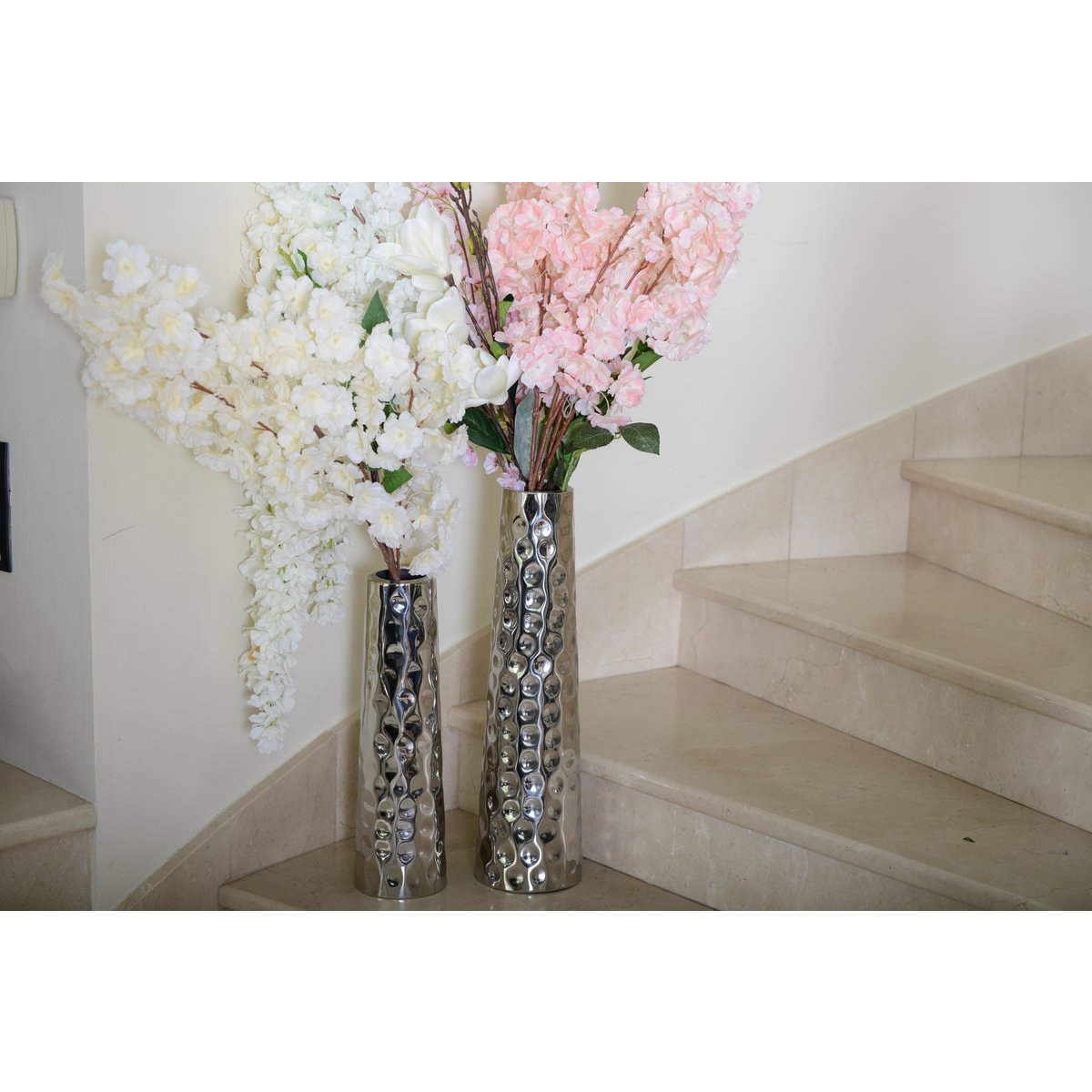 Deze chique vaas, met zijn sprankelende zilveren afwerking, is ontworpen om uw ruimte te verrijken met eigentijdse elegantie. De elegante vorm en verfijnde details voegen een discrete luxe noot toe, terwijl de zilveren glans uw decor verlicht. Het hedendaagse silhouet van de vaas maakt het een perfect centraal element om een vleugje subtiele verfijning en moderniteit in uw ruimte te brengen.