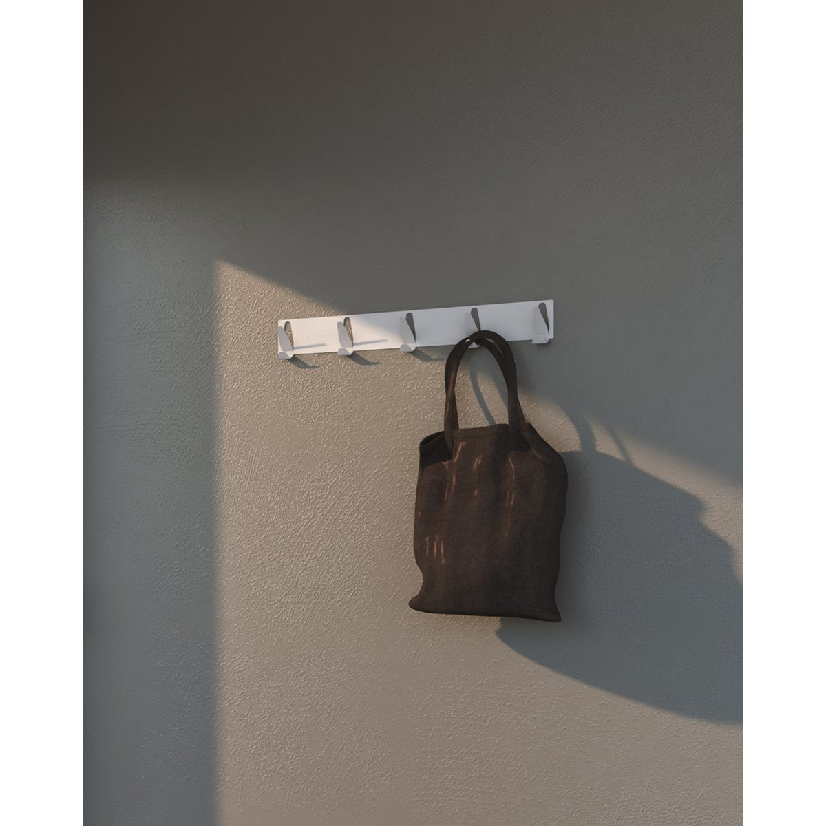 Deze moderne kapstok is gemaakt van hoogwaardig staal en is ontzettend stevig. Daarnaast bestaan de haken en de rest van de kapstok uit één geheel. Een fascinerend en strak detail van de kapstok is dat het lijkt alsof de haken uit de rest van de kapstok zijn gesneden. De haken staat licht naar voren gekanteld, zodat je er iets aan kunt ophangen. Een robuust, strak en sprekend design!