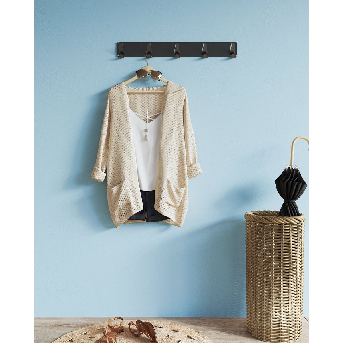 De wandkapstok is ideaal voor een bijzondere gelegenheden waarbij veel personen over de vloer komen. De bovenste haken zijn langer, waardoor het mogelijk is om meerdere jassen aan op te hangen. De haken zijn uitermate geschikt om zowel jassen met kleine lusjes, jassen zonder lusjes en voor tassen met bredere banden.