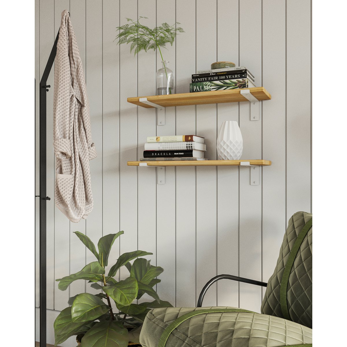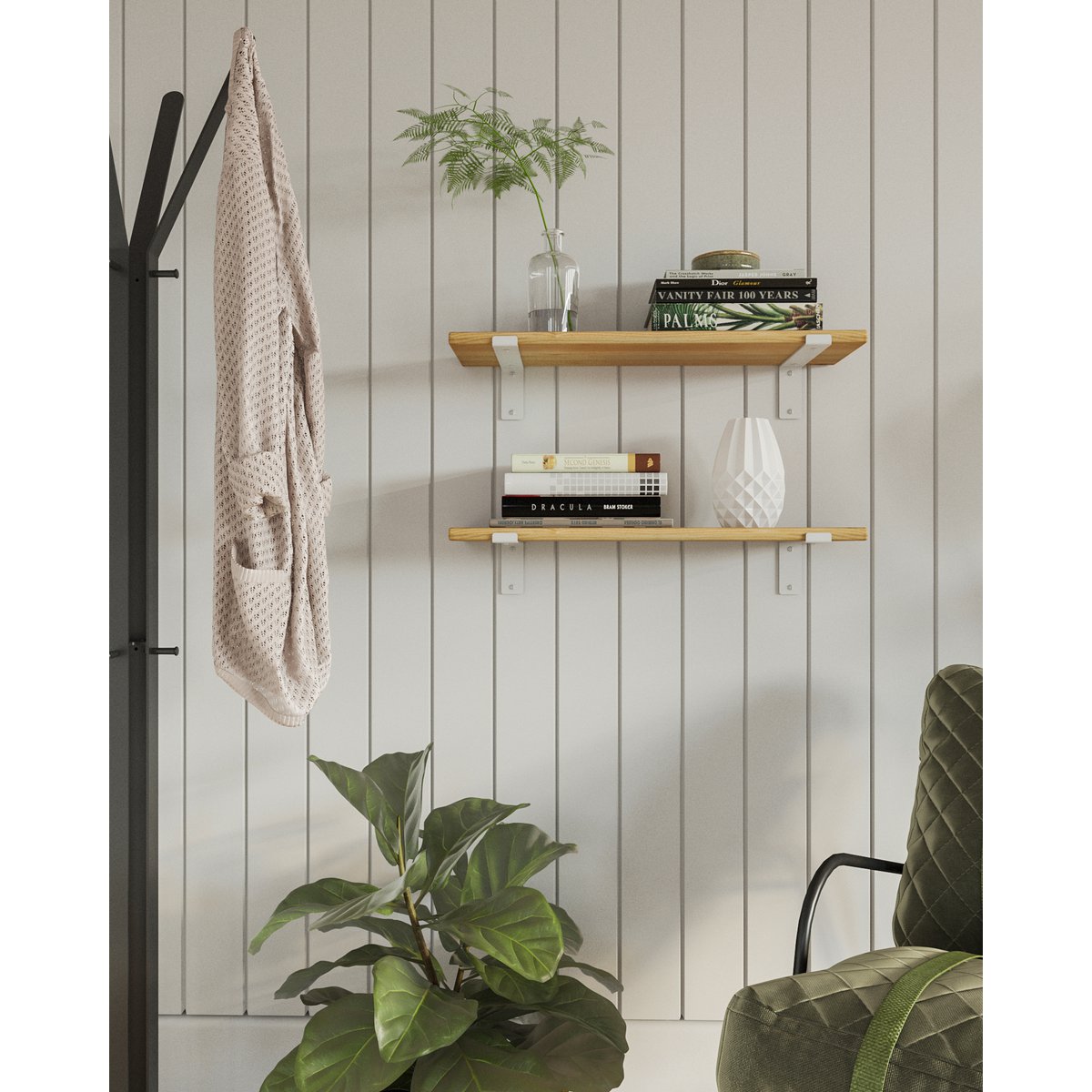 Met de Gorillz Wagon plankendragers creëer je extra opslagruimte of een stijlvolle boekenplank. Deze industriële stalen beugels zijn een sfeervolle aanwinst voor je interieur. De 2 legplankdragers komen met instructies en alle bevestigingsmaterialen zoals schroeven en pluggen voor een moeiteloze installatie. De beugels worden geproduceerd in een milieubewust proces en zijn gemaakt van gerecycled staal. De Wagon is beschikbaar met verschillende binnenmaten (20, 25 en 30 cm) en in de kleuren wit en zwart. Eigenschappen: Set van 2 plankdragers Afmeting beugel: 257 x 38 x 65,5 mm Beschikbare binnenmaten: 20, 25 en 30 cm Gemaakt van hoogwaardig staal Duurzaam geproduceerd Inclusief bevestigingsmateriaal Makkelijk te monteren Monteer de Wagon met de meegeleverde bevestigingsmaterialen. Bevestig de planken dragers met de 4 muurpluggen en 4 bijbehorende schroeven aan de wand. Schroef vervolgens een plank stevig door de beugels met de overige 4 korte schroeven. Markeer de gaten vooraf, om er zeker van te zijn dat het geheel waterpas komt te hangen. Maak je eigen boekenplank Met de Wagon plankdragers van Gorillz creëer je zelf een prachtige boekenplank of meer opbergruimte. Monteer bijvoorbeeld een karakteristieke of moderne houten legplank om de look van je woonkamer of slaapkamer volledig af te maken. De beugels zijn beschikbaar in 20, 25 en 30 cm diep is zijn gemaakt van sterk metaal. Duurzaam geproduceerd Dit product wordt duurzaam geproduceerd in onze eigen fabriek. De volledig productie is duurzaam dankzij het gebruik van zonne-energie. De gebruikte materialen zijn gemaakt van gerecyclede grondstoffen. Maak een milieubewuste keuze met de meubels en accessoires van Gorillz!