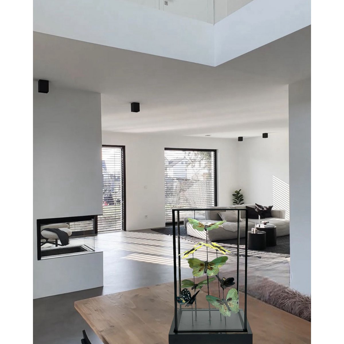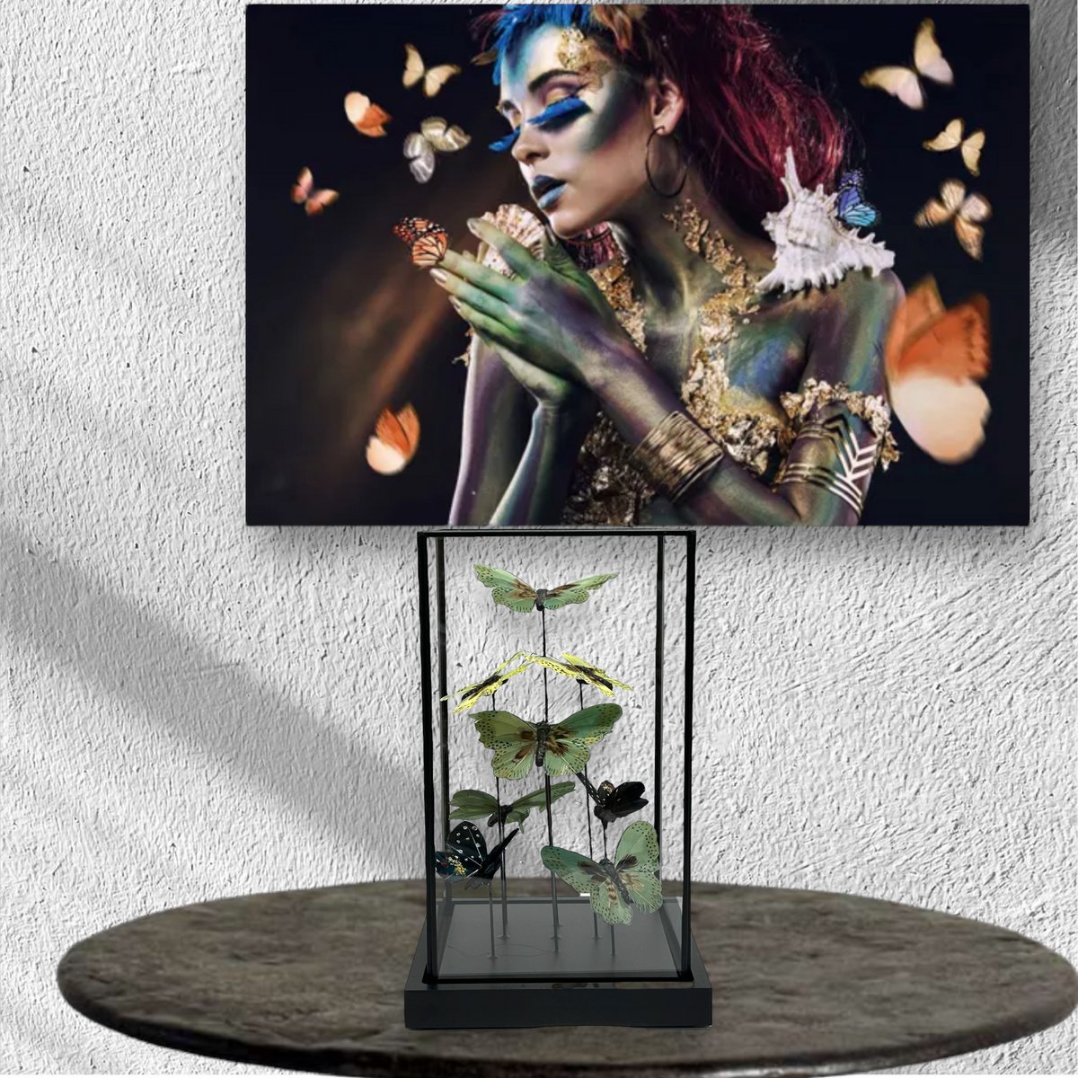 Breng de sereniteit van de natuur in huis met onze elegante glazen stolp met groene vlinders, ethisch functionele uit zijde van veren voor een levensechte weergave. Volledig met de hand gemaakt en ingewikkeld in ontwerp, dit stijlvolle item is de perfecte aanvulling voor elk type interieurdecoratie.