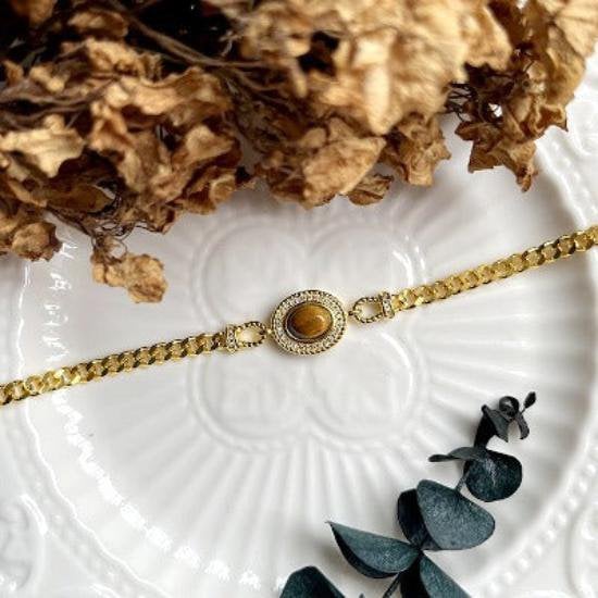 Deze Franse vintage stijl kettingarmband met Tiger Eye Stone is een prachtig en stijlvol stukje sieraad dat klassieke ontwerpelementen combineert met een moderne touch. Het middelpunt van de armband is de Tiger Eye Stone, die bekend staat om zijn opvallende goudbruine kleur en unieke bandpatronen. Van deze steen wordt gezegd dat het moed, kracht en zelfvertrouwen bevordert, waardoor het een uitstekende keuze is voor iedereen die op zoek is naar een boost van vertrouwen. De ketting is gemaakt van messing, in 18k echt vergulde goud. De kreeften sluiting zorgt voor een veilige pasvorm en zorgt voor eenvoudig aan en uit. Bovendien maakt de verstelbare functie het veelzijdig en gemakkelijk te dragen, omdat het kan worden aangepast om te passen bij een verscheidenheid aan polsmaten. Wat is de genezende kracht van Tiger Eye? ♥ Bescherming ♥ Clear Thinking ♥ Persoonlijke empowerment ♥ Integriteit ♥ Willpower ♥ OPSPROKEN ♥ Power ♥ Moed Een steen van bescherming, Tiger Eye kan ook veel geluk brengen aan de drager. Het kan de geest focussen, mentale duidelijkheid bevorderen en ons helpen bij het oplossen van problemen die objectief en onbewust door emoties worden opgelost. Tiger Eye behandelt de ogen en keel, laat gifstoffen vrij, verlicht pijn en helpt gebroken botten te repareren en de uitlijning van de wervelkolom te versterken.