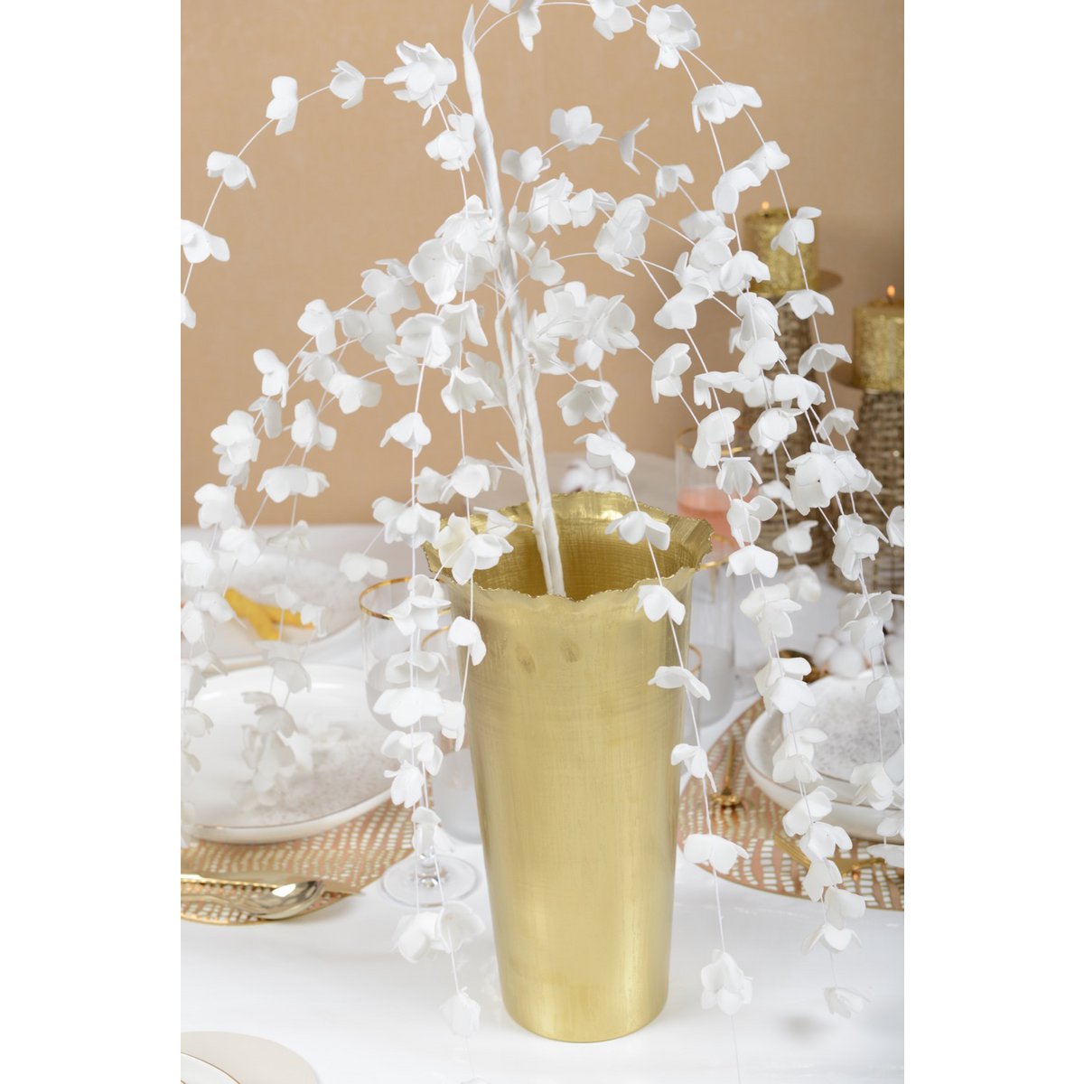 Deze onderscheidende vaas is een echt onderdeel van het ontwerp dat een avant-garde aanraking in uw interieur zal brengen. De wijd uitlopende vorm, geïnspireerd door de bloemblaadjes van een bloem, gecombineerd met Matt Golden Finish, creëert een boeiend en eigentijds visueel effect. Deze vaas valt op als een werk van moderne kunst en voegt een vleugje originaliteit en verfijning toe aan uw ruimte.