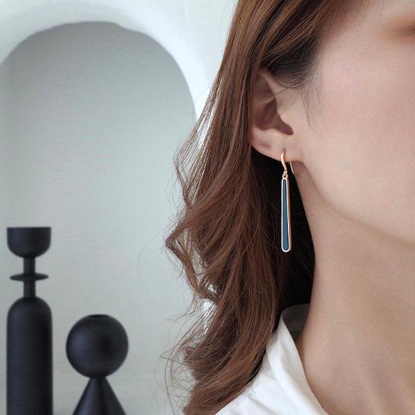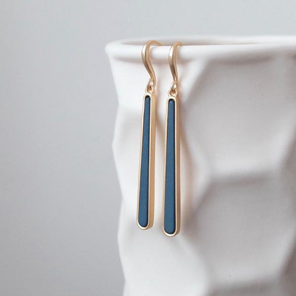 De oorbellen zijn voorzien van een unieke geometrische blauwe lijn emaille druppel, die stevig is bevestigd aan de vergulde koperen...