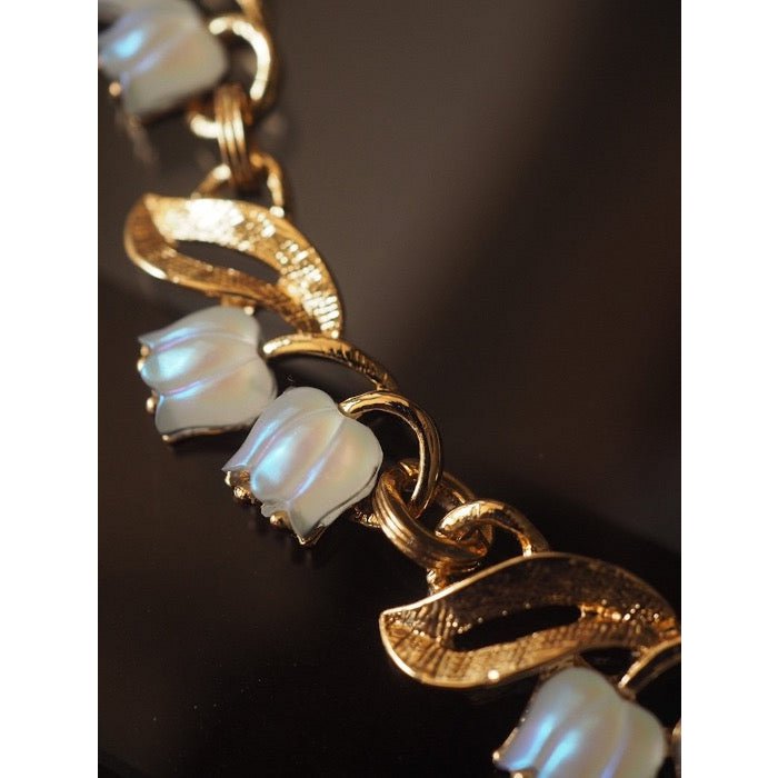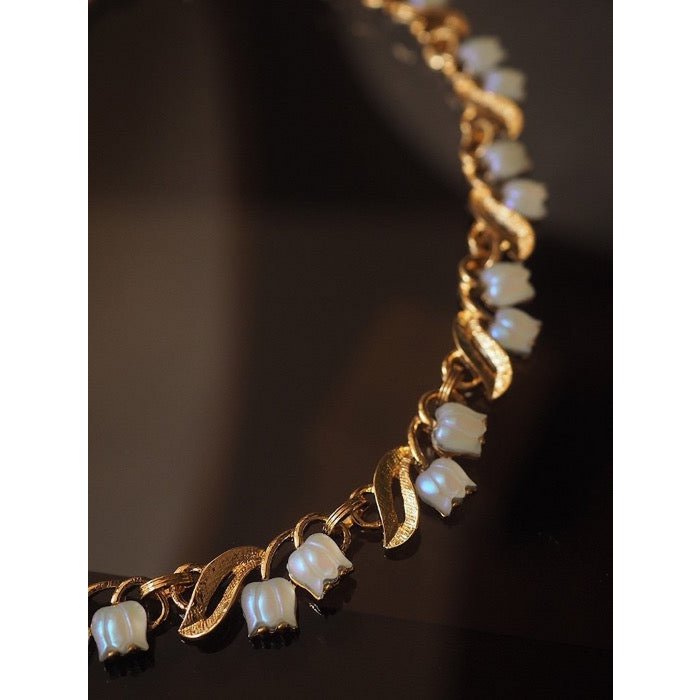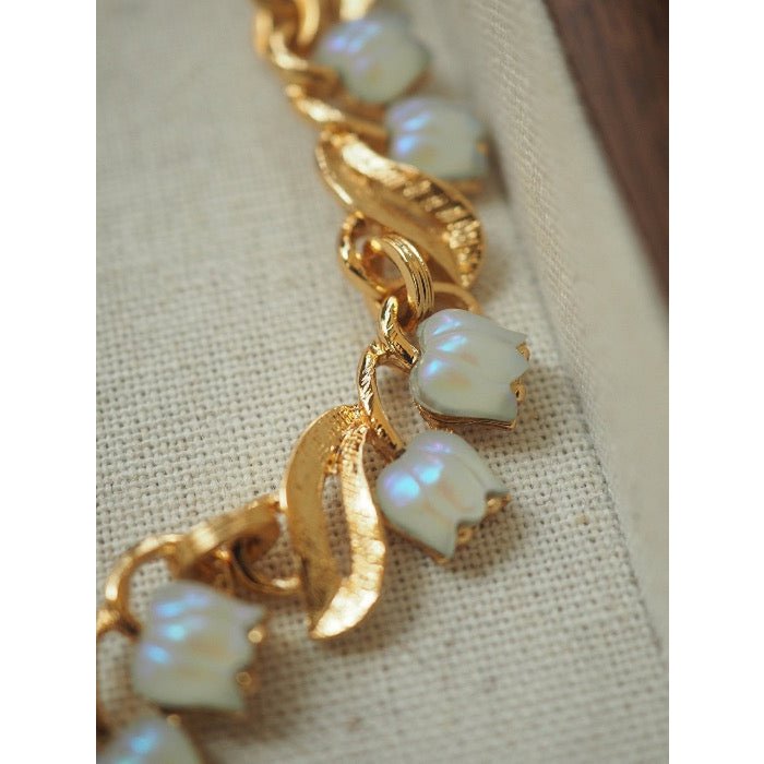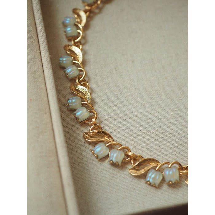Deze ketting doet denken aan de iconische Trifari-stijl en heeft een gedetailleerd ontwerp met delicate lelietje-van-dalen-bloemen. Deze ketting is gemaakt van messing op een vergulde basis. De verstelbare lengte van 52 + 7 cm voegt veelzijdigheid toe aan uw styling, waardoor u het kledingstuk kunt aanpassen aan verschillende halslijnen. De stoere vintage look van deze ketting maakt hem tot het perfecte accessoire om je outfit van de dag (OOTD) naar een hoger niveau te tillen met een vleugje retro glamour. De Moonlight Muguet ketting is niet zomaar een sieraad; het is een perfecte cadeaukeuze voor degenen die de charme van vintage-esthetiek waarderen. Wat symboliseert de Lelietje-van-dalen? Het lelietje-van-dalen is een embleem van zoetheid en nederigheid; de kleine, klokvormige bloemen vertegenwoordigen bescheidenheid en eenvoud. Deze elegante bloesem omarmt de Victoriaanse taal van bloemen en brengt de oprechte wens over naar de "terugkeer van geluk" en wordt vaak gekozen om speciale gelegenheden te vieren. De ongerepte witte tint van het lelietje-van-dalen staat ook voor zuiverheid en vernieuwing, waardoor het een populaire keuze is voor bruidsboeketten en een symbool van zuiverheid in christelijke tradities. Bovendien wordt deze charmante bloem in verschillende culturen geassocieerd met geluk en positieve resultaten, wat bijdraagt aan haar reputatie als voorbode van vreugde en geluk.