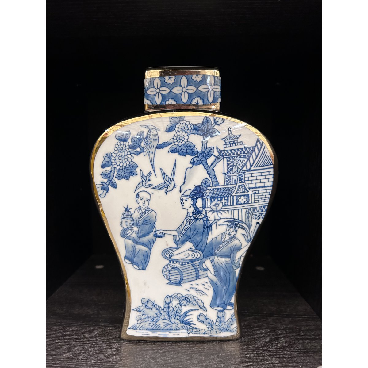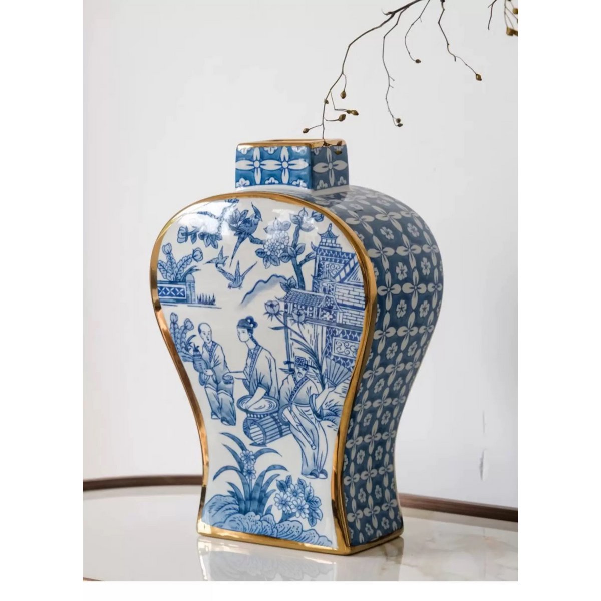 The vase is hand-painted in a classic blue-and-white color scheme, reflecting refined craftsmanship and a timeless elegance. The design draws inspiration from the rich history of both Chinese and European porcelain traditions.