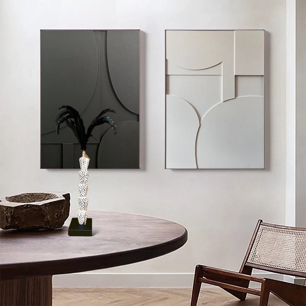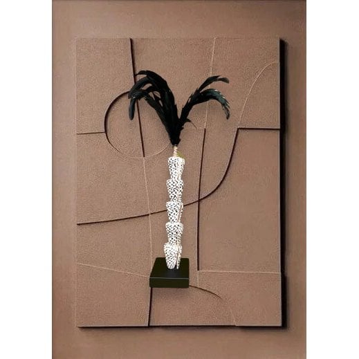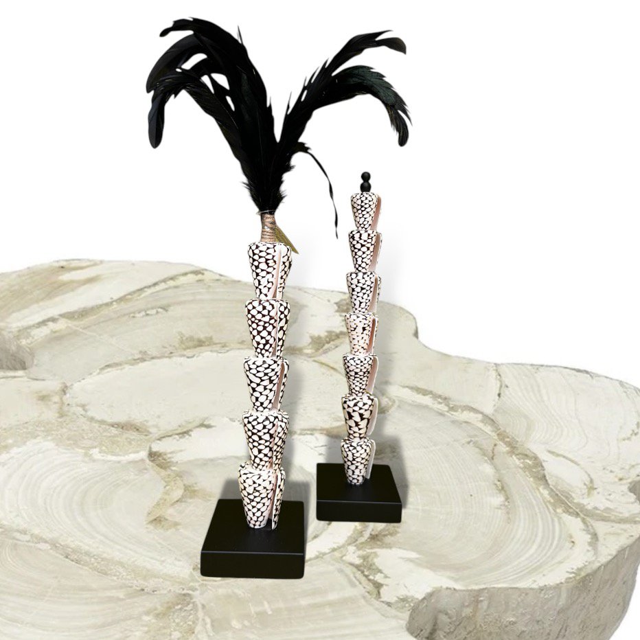 Elegante stambeeld gemaakt van schelpen en . zwarte veren, volledig handgemaakt .Hoogte: 33cm.Breedte: 7cmHoogte: 33cmLengte: 7cmGewicht: 800gkleuren: Zwart, Witmerk: QMF...