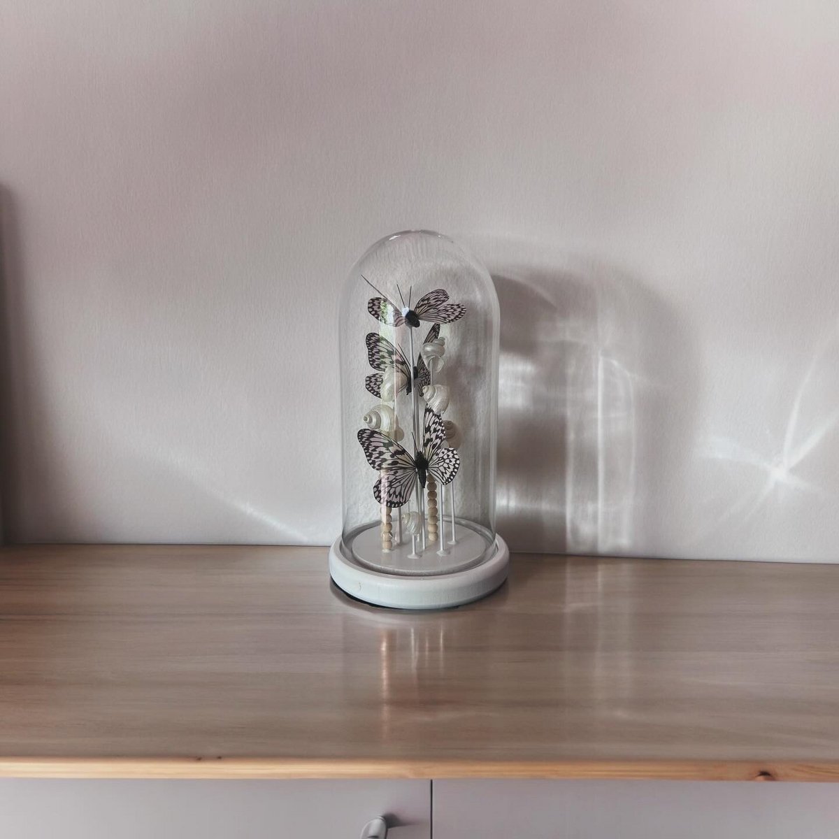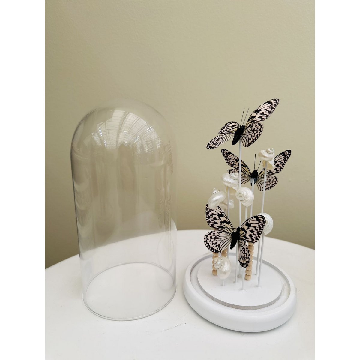 Plaats de glazen stolp in een open wandkast, op je dressoir of op een tafel. De vlinderstolp is gemaakt van glas en heeft een witte houten onderkant. Combineer deze vlinderstolp met een van onze andere mooie accessoires voor een prachtig geheel in huis.