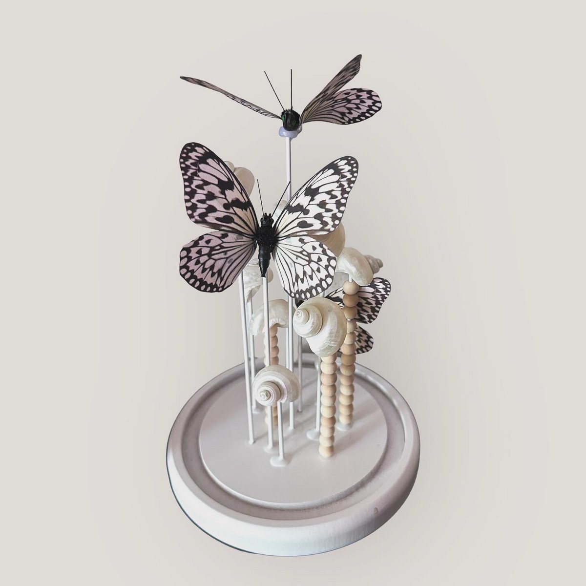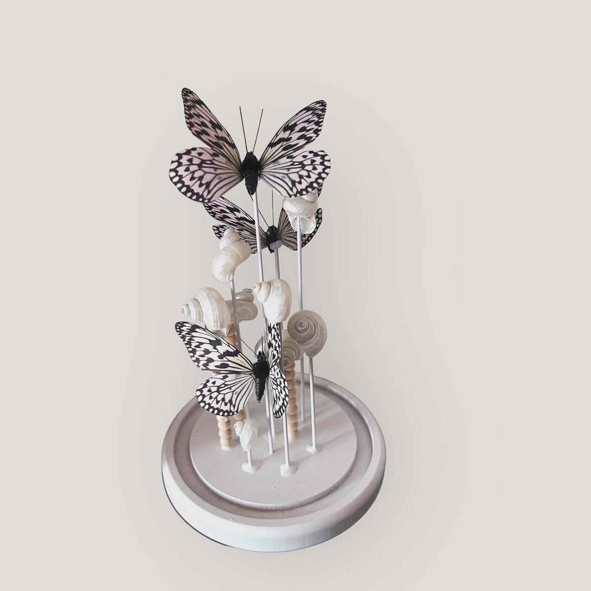 Breng de sereniteit van de natuur in huis met onze elegante glazen stolp, waarin parelmoeren schelpen, een houten kralenketting en zorgvuldig nagemaakte vlinders zitten, ethisch vervaardigd uit zijde voor een uniek dromerig Bali-effect. Volledig handgemaakt en verfijnd in design, is dit stijlvolle item de perfecte aanvulling op elke interieurdecoratie.