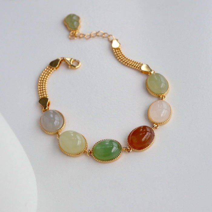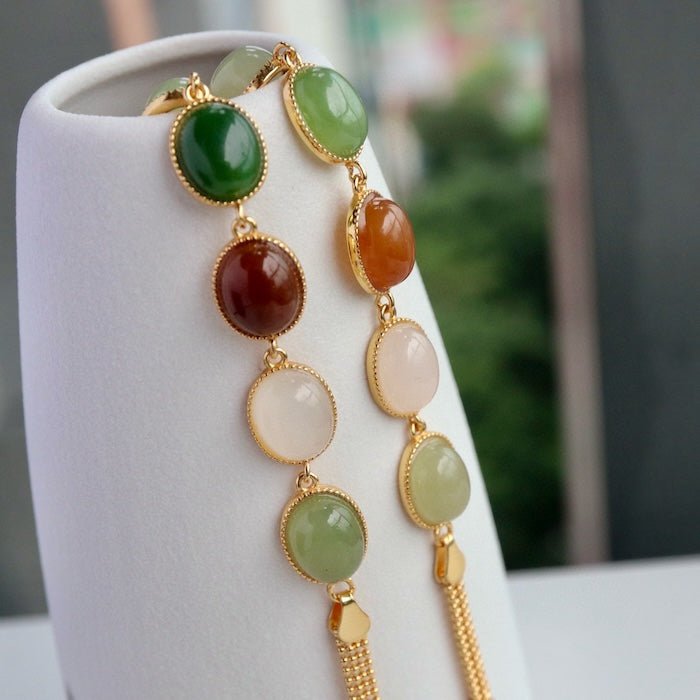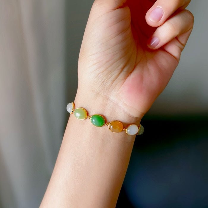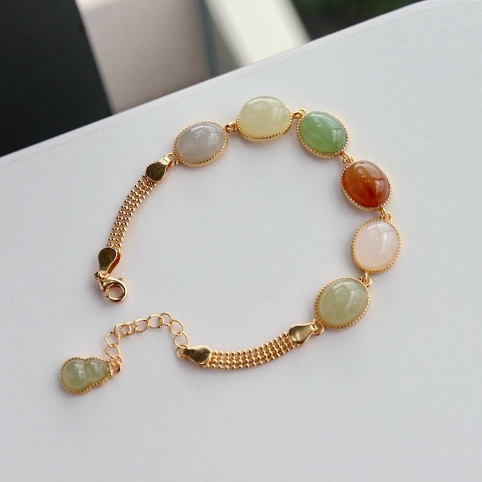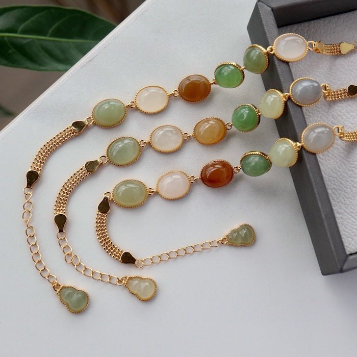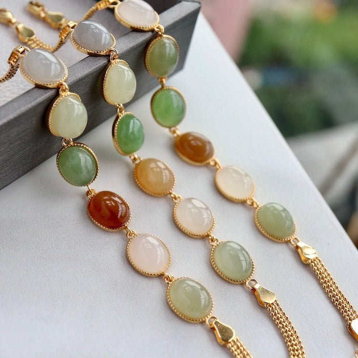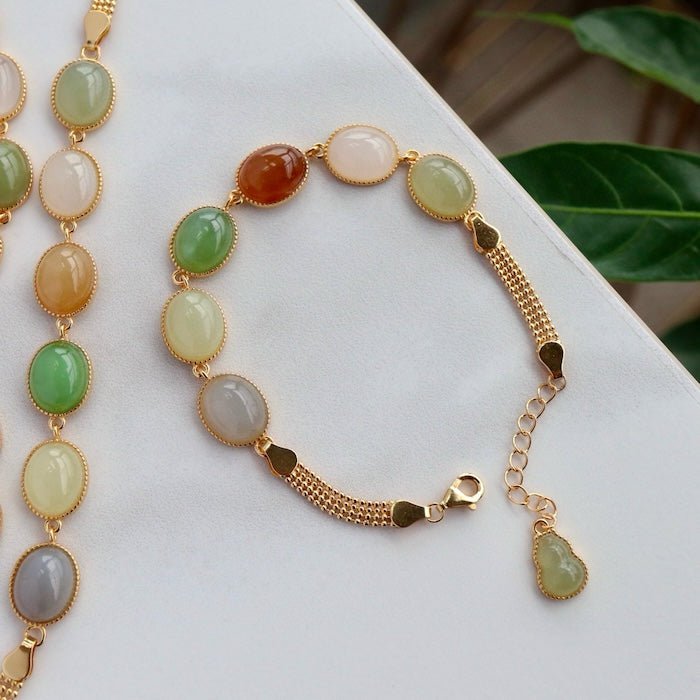 Dit verbluffende stuk toont de diverse tinten van Jade, die elk verschillende aspecten van geluk en welvaart symboliseren. De armband heeft zes ovale jade -kralen, elk ingelijst in elegante gouden vermeil. De levendige rode en barnsteenjade kralen symboliseren schoonheid, de lichtgroene jade vertegenwoordigt energie, de levendige groene jade betekent welvaart en geluk, en de Gray Jade staat voor leiderschap. De armband is instelbaar en meet 16 cm met een extra verlengingsketen van 6 cm. Het luxueuze en veelzijdige ontwerp maakt het een ideaal en zinvol cadeau voor haar. Wat is de genezende kracht van jade? ♥ Stabiliteit ♥ Longevity ♥ vruchtbaarheid ♥ Sereniteit ♥ Wijsheid ♥ OPPROCUSITEIT ♥ Tranquility ♥ Balans ♥ Peace ♥ Harmony ♥ Mation ♥ Perspectief A Protective Stone, Jade houdt de drager van schade en brengt Harmony. Jade trekt geluk en vriendschap aan. Het stabiliseert de persoonlijkheid en bevordert zelfvoorziening. Het kalmeert de geest en laat negatieve gedachten vrij. Een "Dream Stone", Jade brengt inzichtelijke dromen met zich mee. Het helpt emotionele release, vooral met prikkelbaarheid. Jade moedigt je aan om te worden wie je echt bent. Jade helpt de filtratie- en eliminatieorganen van het lichaam. Het is uitstekend voor het behandelen van nierproblemen en bijnieren. Jade verwijdert gifstoffen, rebinds skeletale en cellulaire systemen en geneest hechtingen. Het helpt vruchtbaarheid en bevalling. Jade balanceert lichaamsvloeistoffen.