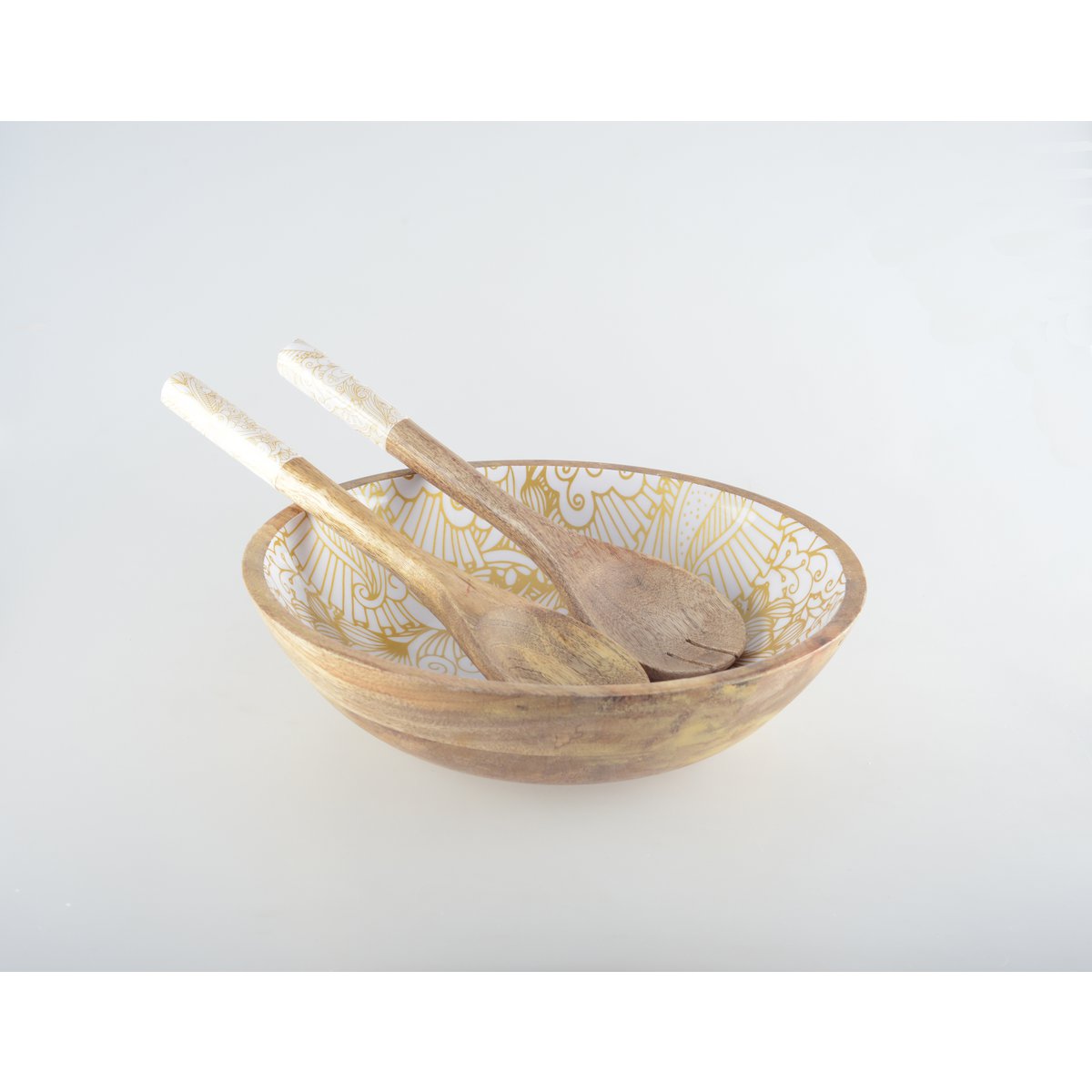 Breng een vleugje moderne elegantie mee aan uw maaltijden met onze houten salade bestek, versierd met witte mouwen en gouden abstracte patronen, voor een tafel die zowel chic als verfijnd is.