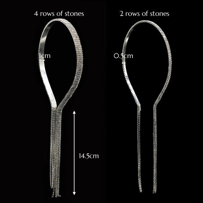 Dit betoverende hoofddeksel is vervaardigd met een volledige inleg van fonkelende kristallen stenen, waardoor een oogverblindende en unieke look ontstaat die zeker zal boeien op uw speciale dag. Het algehele ontwerp straalt een gevoel van romantiek uit, aangevuld door de dynamische en opvallende lange kwastjes die sierlijk achter de oren vallen. Kies uit twee verbluffende opties die bij jouw stijl passen: de brede hoofdband is voorzien van vier rijen glinsterende stenen, terwijl de smalle hoofdband beschikt over twee rijen voor een meer ingetogen maar even betoverende aantrekkingskracht. Deze hoofdbanden kunnen op elkaar worden gestapeld om een op maat gemaakte look te creëren die perfect bij uw trouwkleding past.
