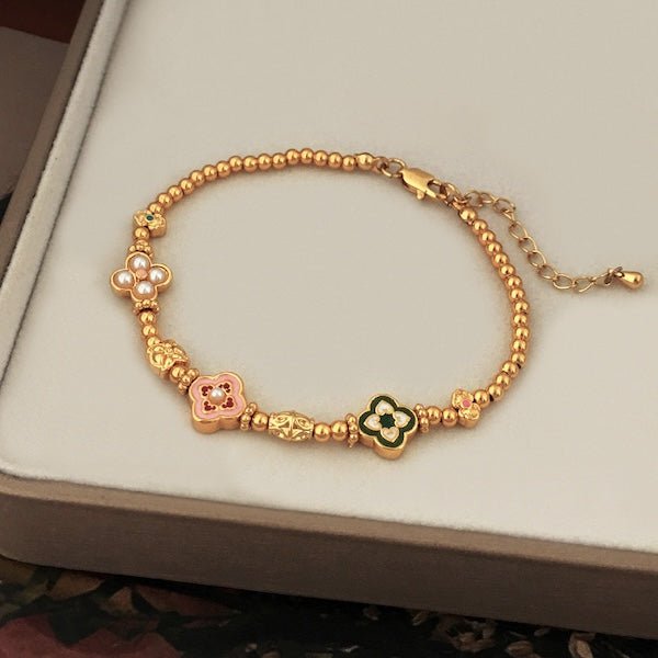 Deze elegante armband combineert vintage charme met moderne verfijning. Traditionele klavervormige charmes, versierd met levendig email, symboliseren veel geluk en...