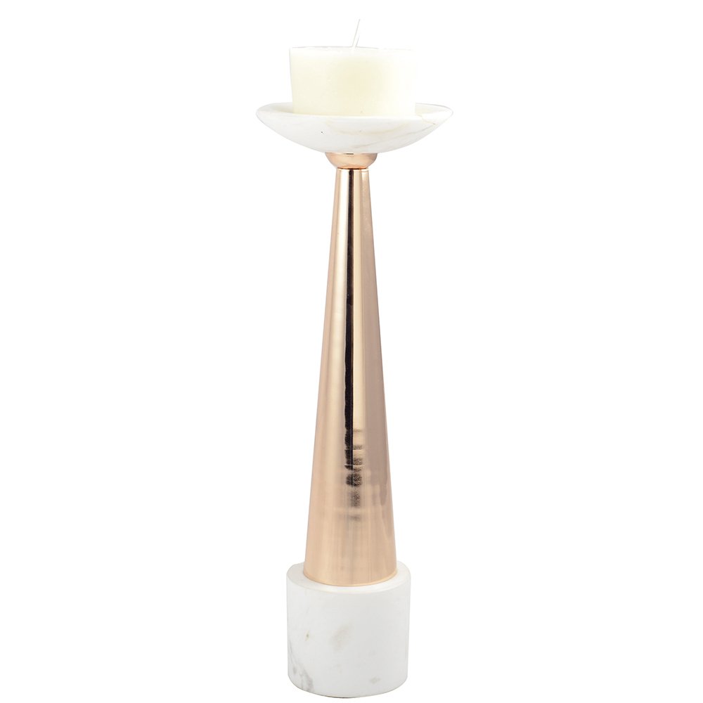 Voeg een moderne luxe aanraking toe aan uw interieur met onze verfijnde kaarsenhouder. Dit model wordt onderscheiden door een nobele marmeren voet die wordt overwonnen door een bijpassende marmeren ondersteuning, terwijl de centrale structuur is versierd met een geborstelde gouden rozenafwerking. Deze subtiele associatie tussen de natuurlijke stevigheid van marmer en de delicate schittering van roségoud geeft deze kandelaar een uniek, zowel elegant als eigentijds karakter.