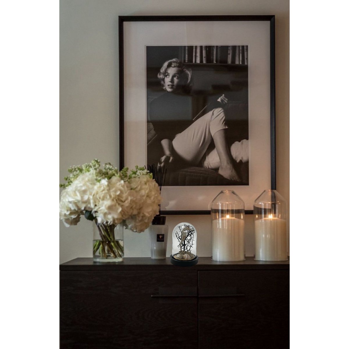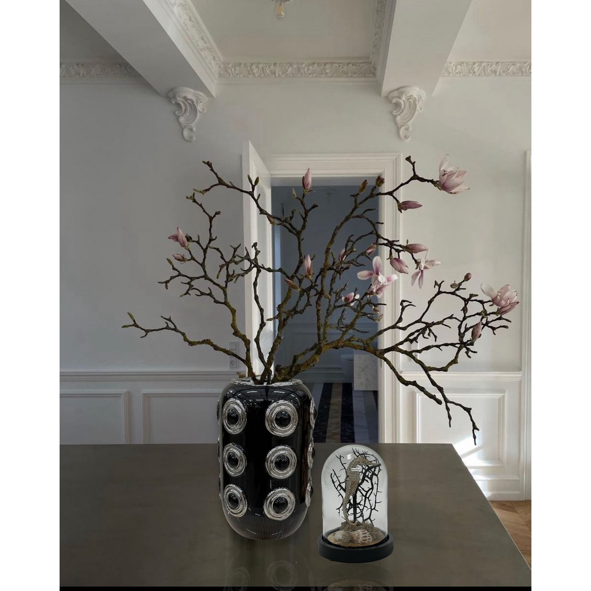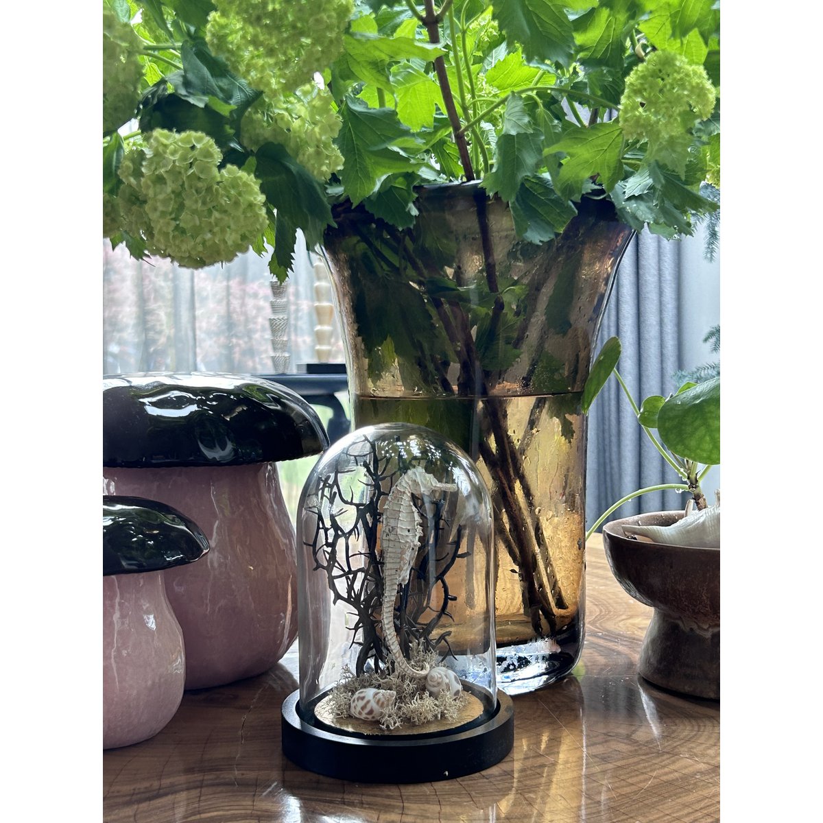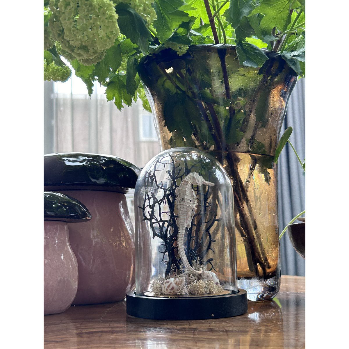 De zeepaardje is gemaakt van glas en heeft een houten onderkant in de kleur zwart.