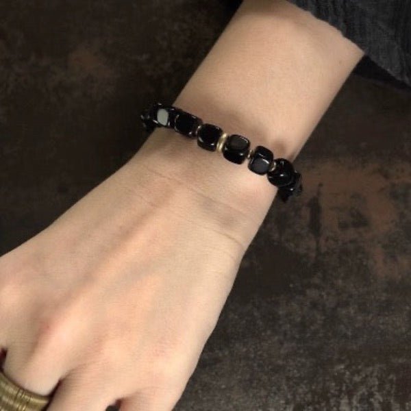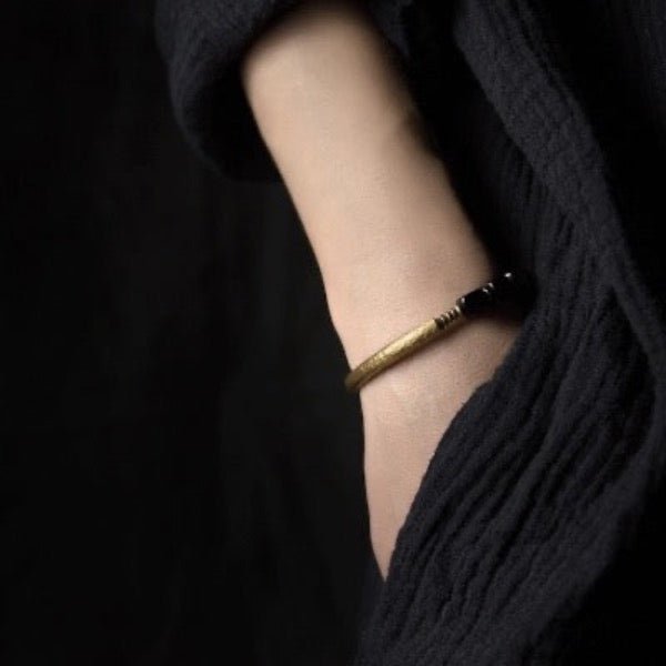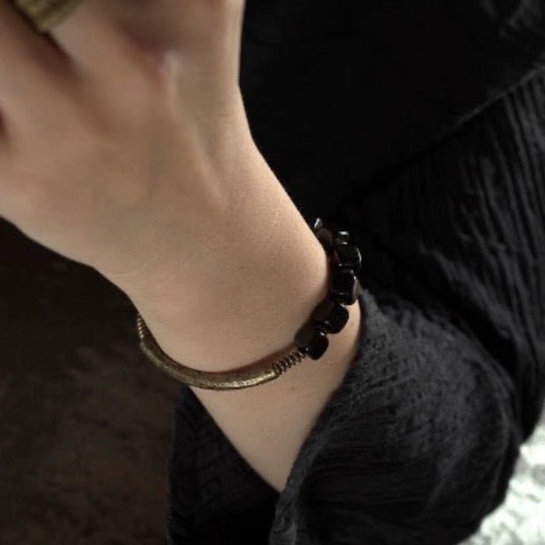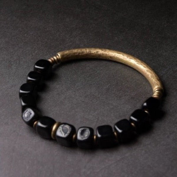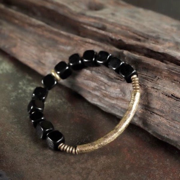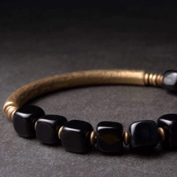 Deze unieke armband heeft een stoere en gedurfde esthetiek, waarbij de ene helft is vervaardigd uit zorgvuldig gesneden zwarte obsidiaanblokken. Obsidiaan staat bekend om zijn helende energie en voegt meer dan alleen stijl toe aan dit accessoire: het geeft een positieve sfeer aan je dagelijkse kleding. De obsidiaanblokken hebben een vintage textuur, wat de algehele aantrekkingskracht van de armband versterkt. De andere helft van de armband bestaat uit een vormgegeven bronzen armband. Met een totale lengte van 18 cm biedt deze armband een harmonieus evenwicht tussen statement en draagbaarheid. Deze armband is meer dan alleen een fashion statement; het is een symbool van kracht en verfijnde smaak voor de hedendaagse gentleman.